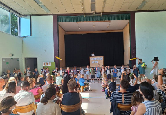 Zur Begrüßung schmetterte der Chor die Keltenbergschul-Hymne von der Bühne. Danach richtete die Schulleiterin Frau Gerhardt Grußworte an alle anwesenden Eltern, Großeltern, Paten, Lehrer sowie die offiziellen Vertreter der Gemeinde.